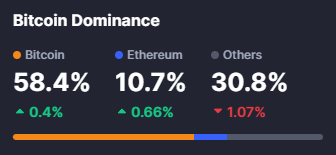 Bitcoin’s share of total crypto market capitalisation rose to 58% this week, its highest level since January 2026. The Altcoin Season Index sits at 35 out of 100, firmly in Bitcoin Season territory, where BTC is outperforming the majority of the top 50 altcoins over the trailing 90 days.